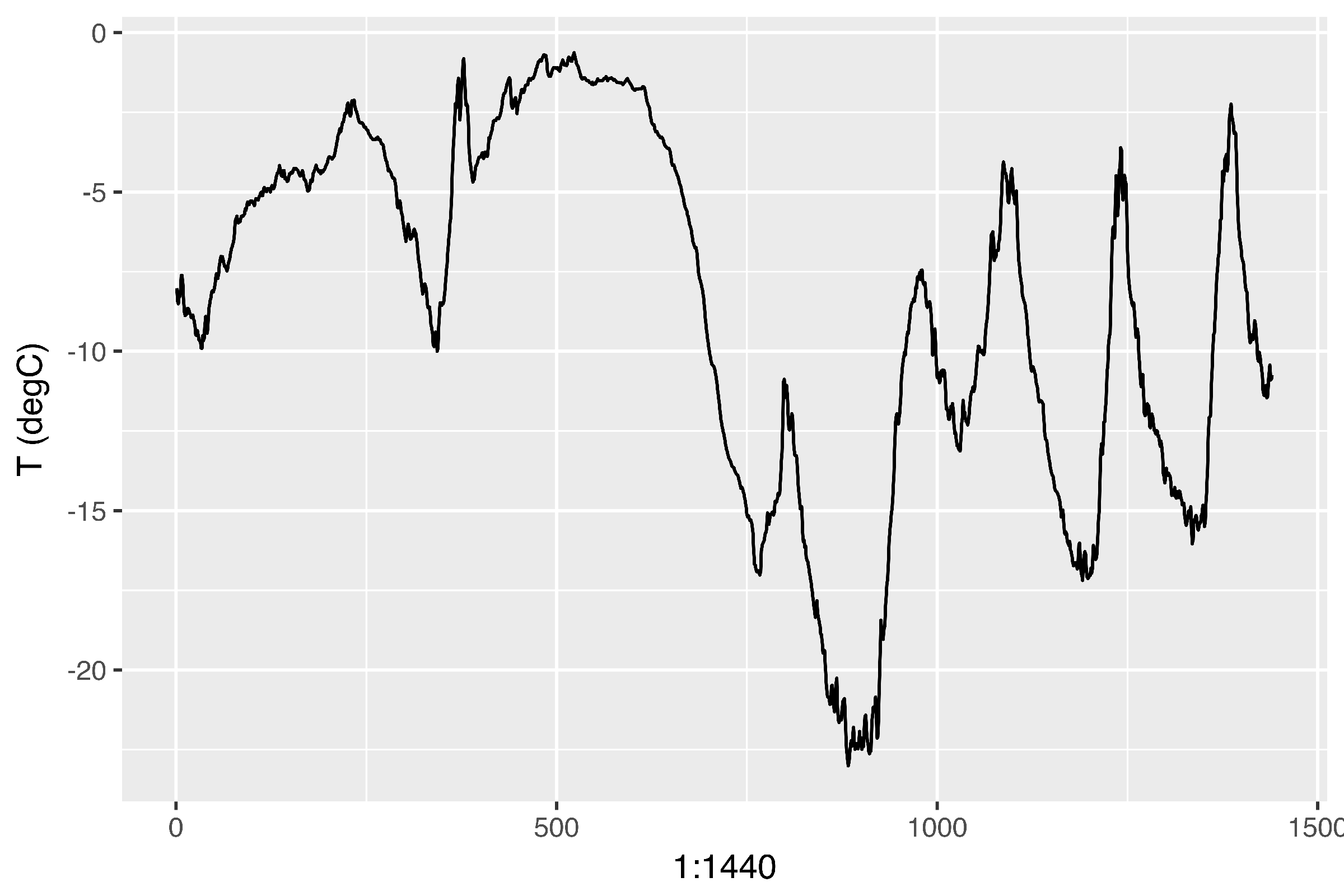 ggplot(data[1:1440,], aes(x = 1:1440, y = `T (degC)`)) + geom_line()