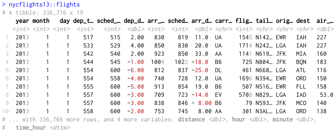 The highlighting is implemented by the new pillar package, which also offers extension points for packages such as hms that provide custom data types. See the Extending tibble vignette for details. We’re still figuring out how to use colour most effectively, so expect this to change in minor ways in the in future. If you have feedback, please let us know by filing an issue in the pillar package.