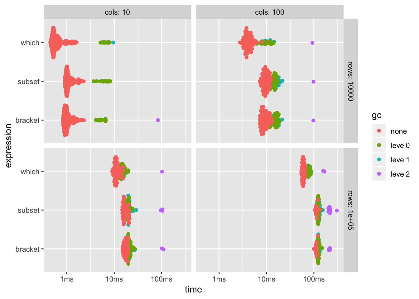ggplot2::autoplot() can be used to generate an informative default plot. This plot is colored by GC level (0, 1, or 2) and faceted by parameters (if any). By default it generates a beeswarm plot, however you can also specify other plot types (jitter, ridge, boxplot, violin). See ?autoplot.bench_mark for full details. This gives you a nice overview of the runs and allows you to gauge the effects of garbage collection on the results.