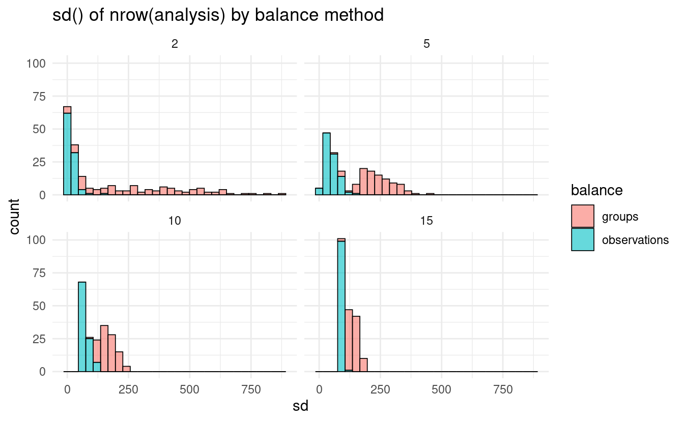 assigns roughly the same number of groups to each of your folds, so you wind up with the same number of patients, or neighborhoods, or whatever else you’re grouping by in each assessment set. The new balance argument lets you instead assign roughly the same number of rows to each fold instead, if you set balance = observations: