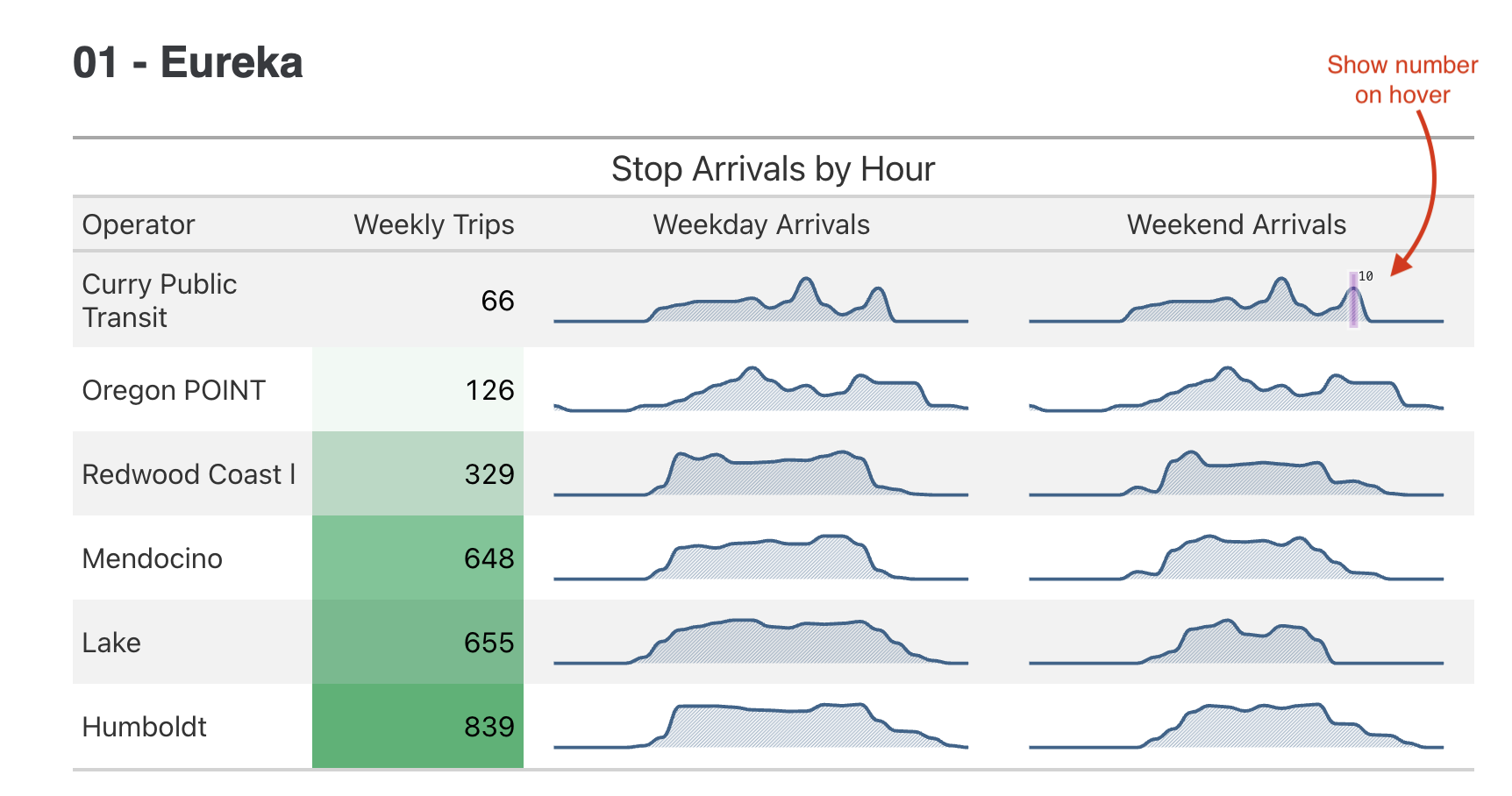 Our 2024 contest saw a great set of transit tables submitted by Tiffany Ku at CalTrans ( submission , github repo ). The submission showed service patterns using stop times binned by hour. It produced these for all California operators!
