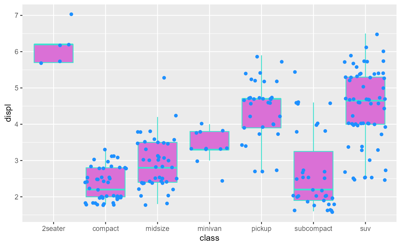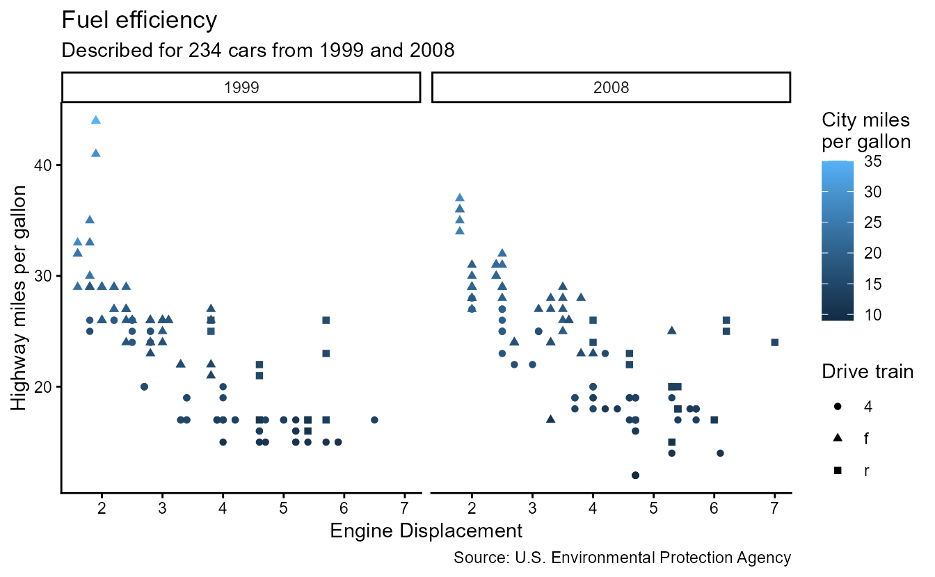 p <- ggplot(mpg, aes(displ, hwy, colour = cty, shape = drv)) +